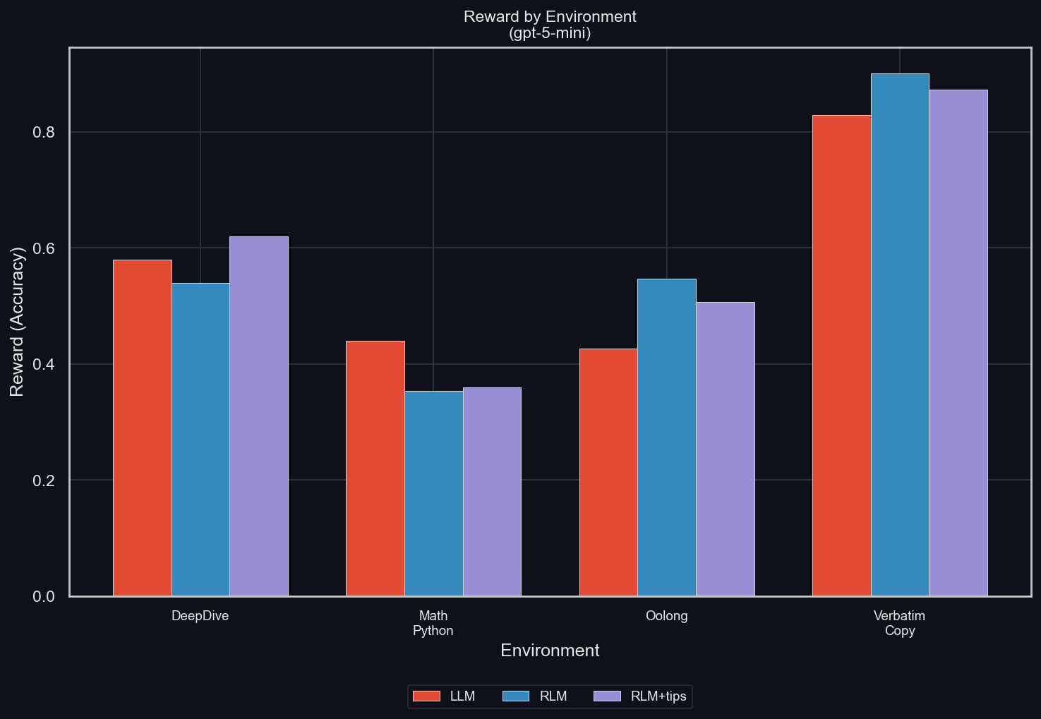 This plot also shows Reward by Subset. This is interesting because it shows a big difference between RLM performance depending on the data type:
