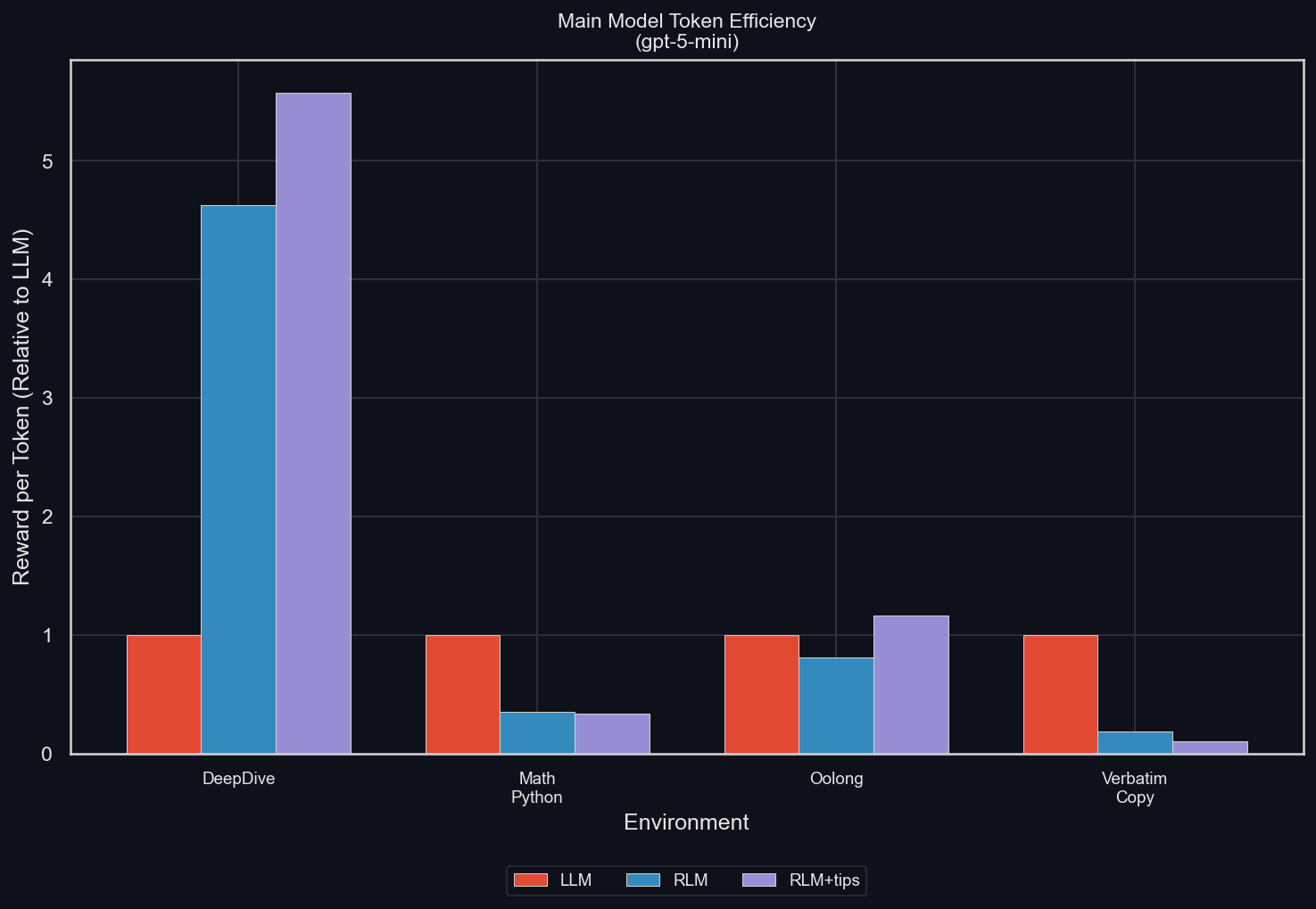 And the main model context length is much lower when using sub-LLMs: in DeepDive, this is immediately apparent, but it's true even in Oolong. The reason why this isn't clearly visible for Oolong is that for the LLM, the API rejects long Oolong inputs, because they exceed the context window. Those are thus counted as having used no tokens. We will see this in more detail later.