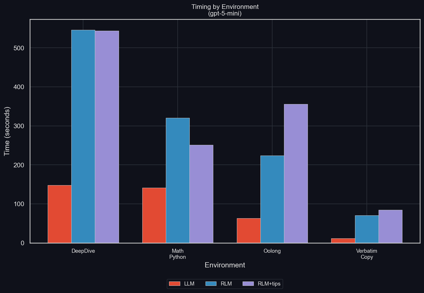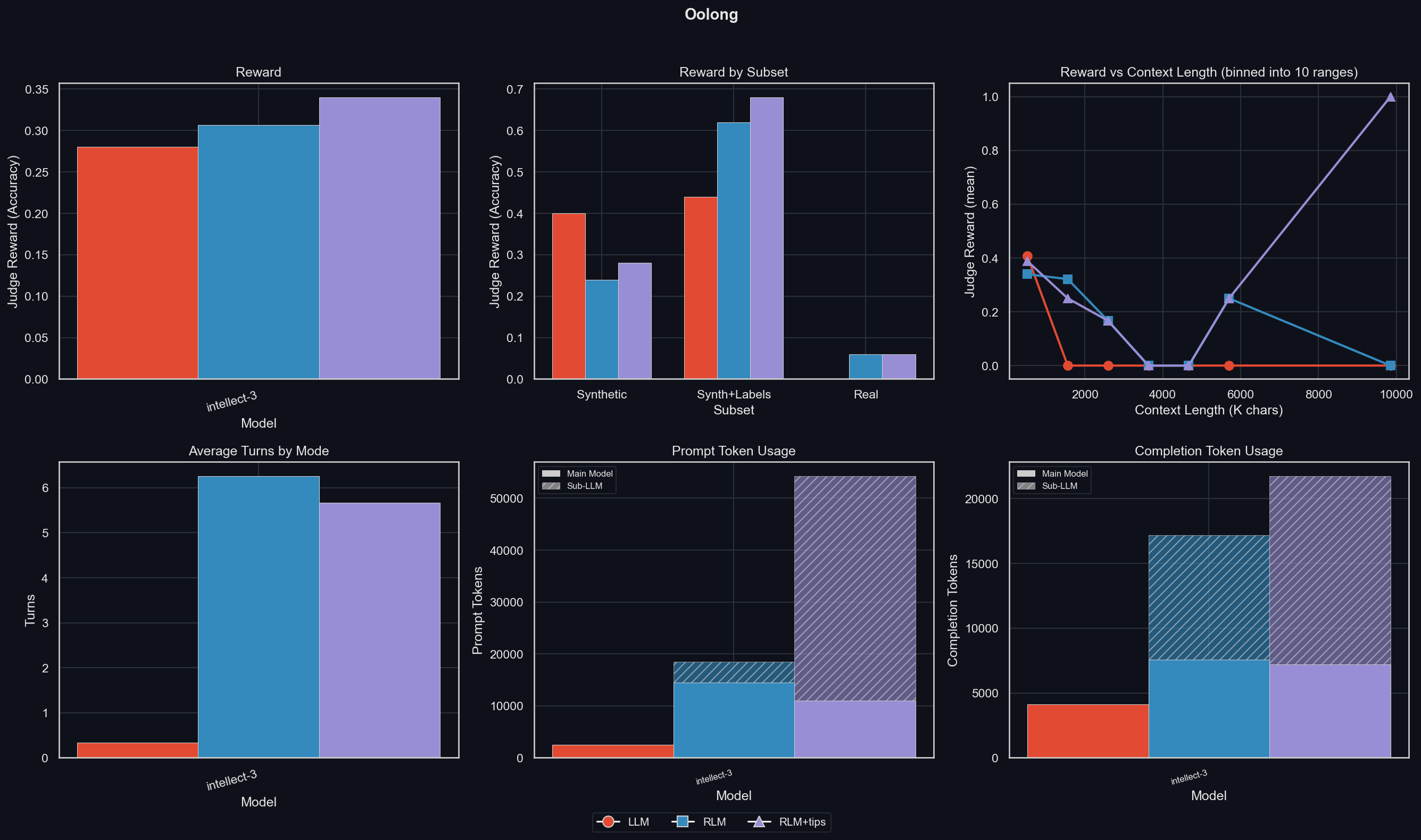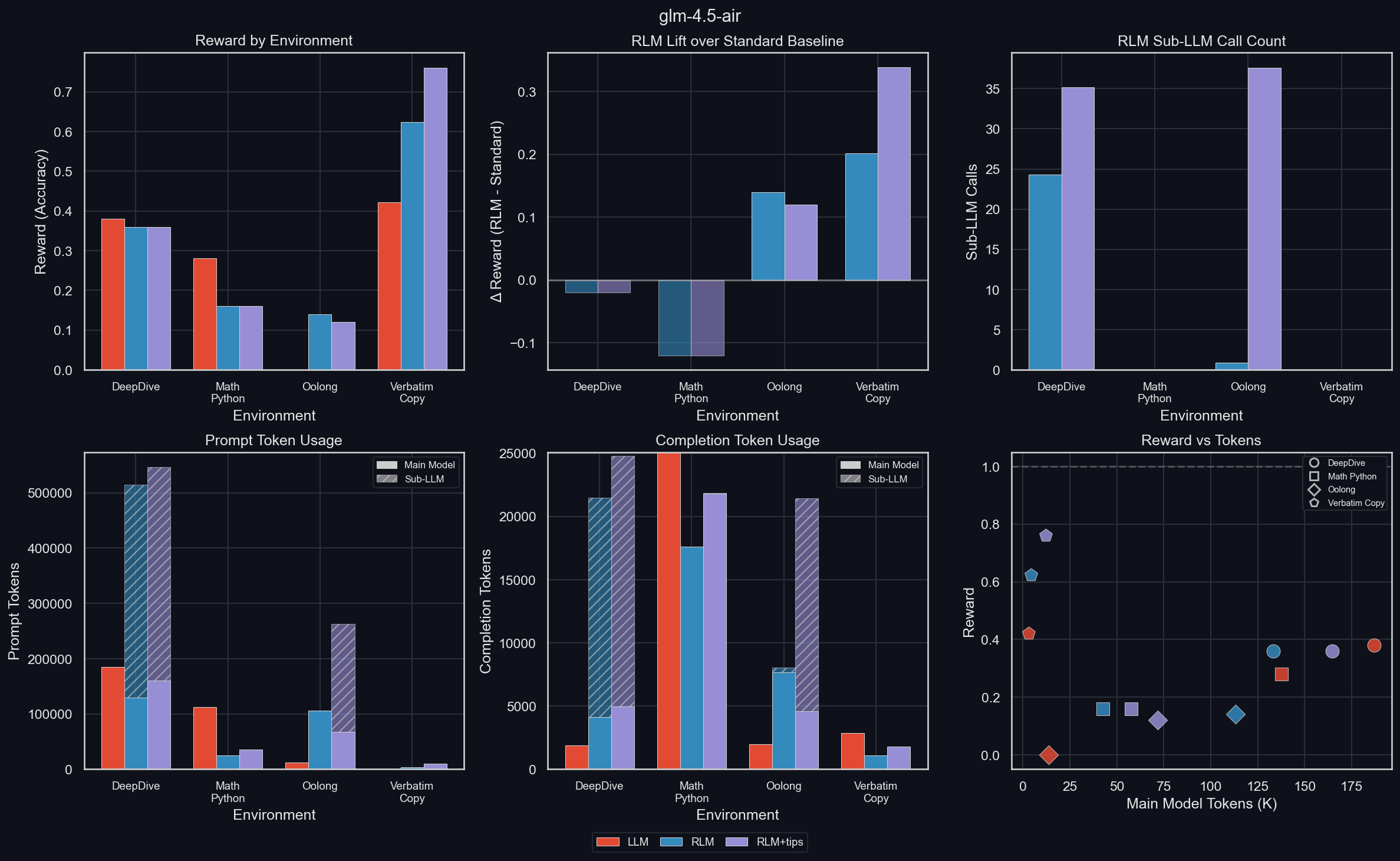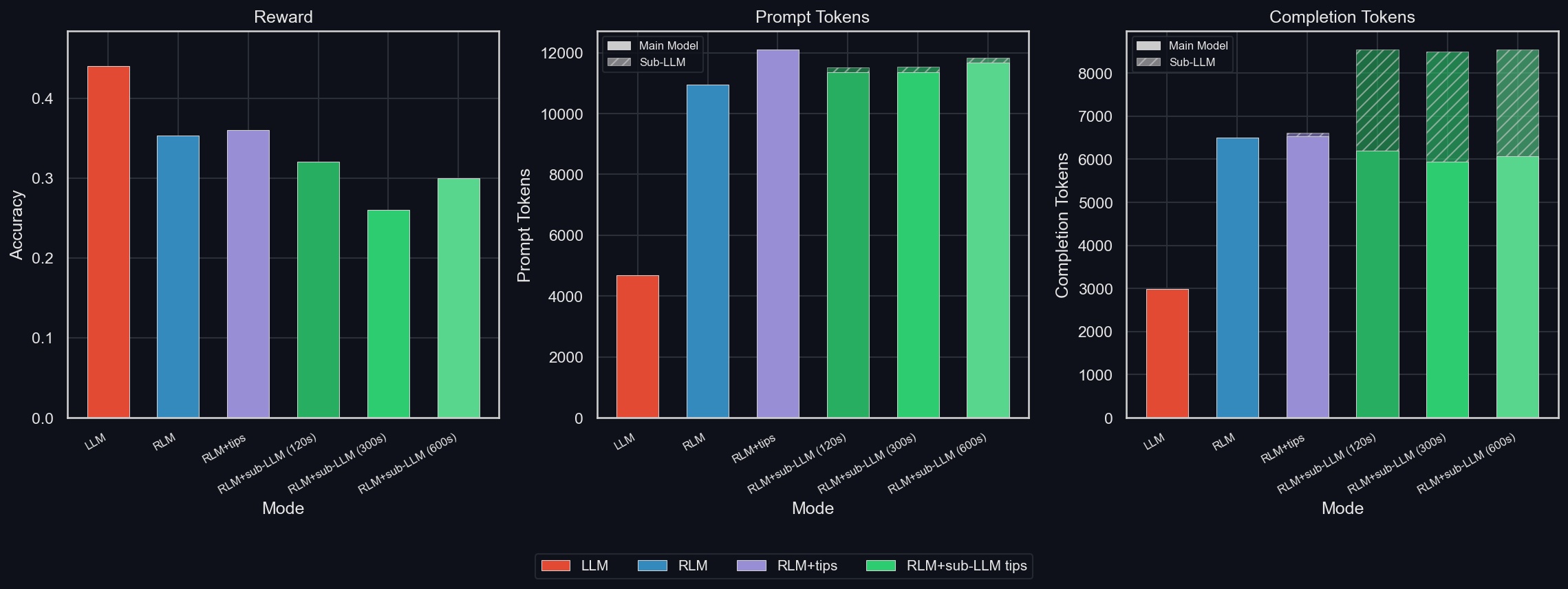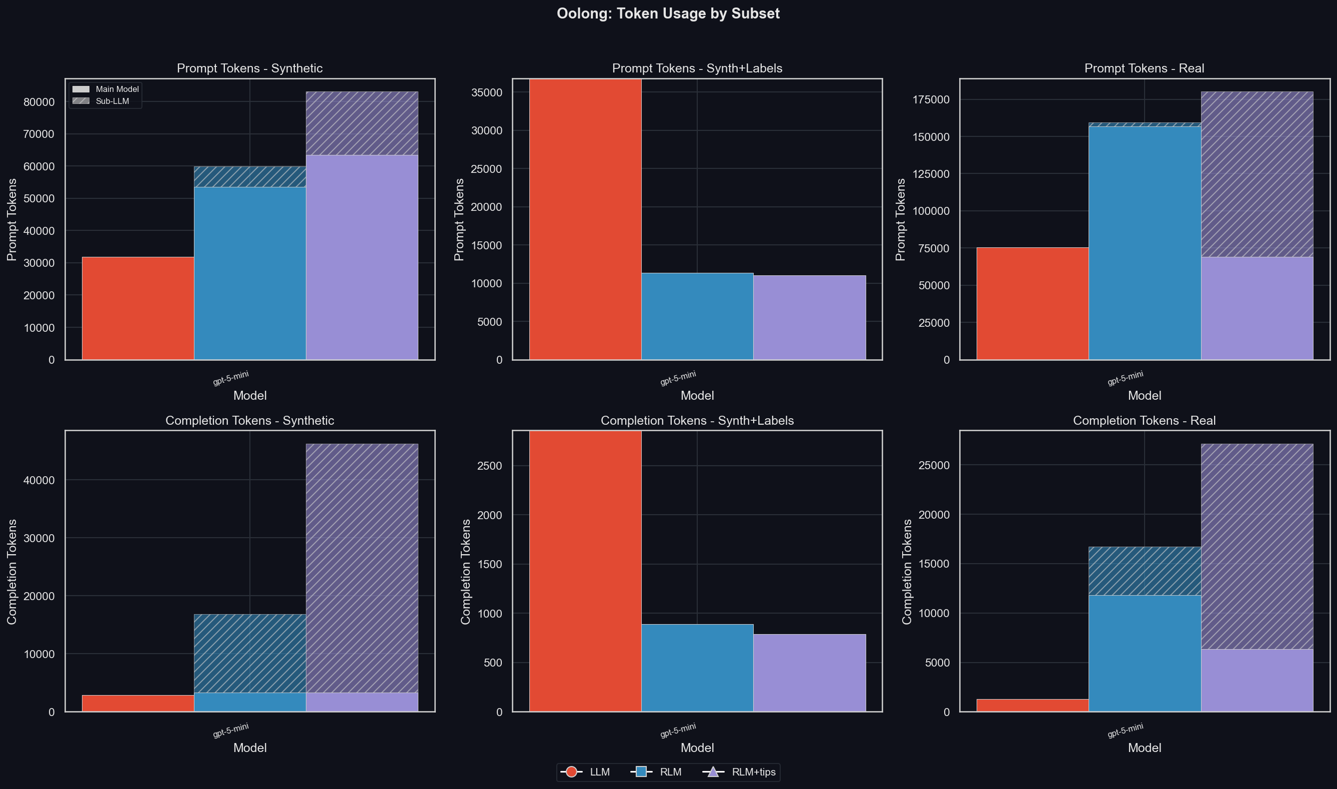 We can see that for the synth dataset, the RLM uses a significant number of prompt tokens, especially when given tips; and almost all completion tokens are by the sub-LLMs. Of course, we already saw that the increased token-usage compared to the LLM comes from the later simply not consuming or producing any tokens for any but the shortest of contexts in the synth split.