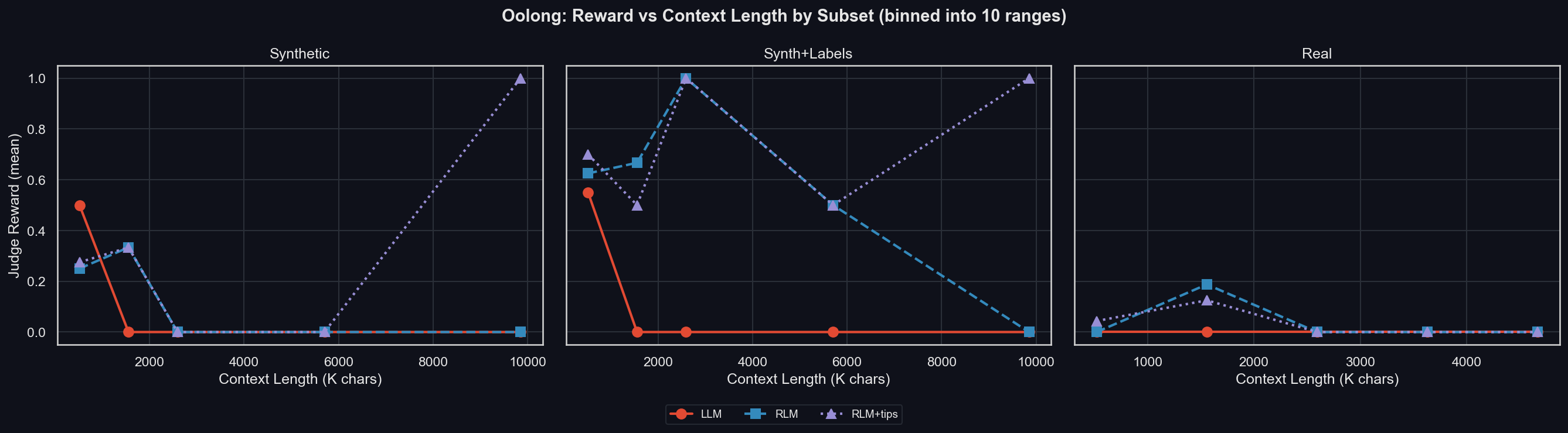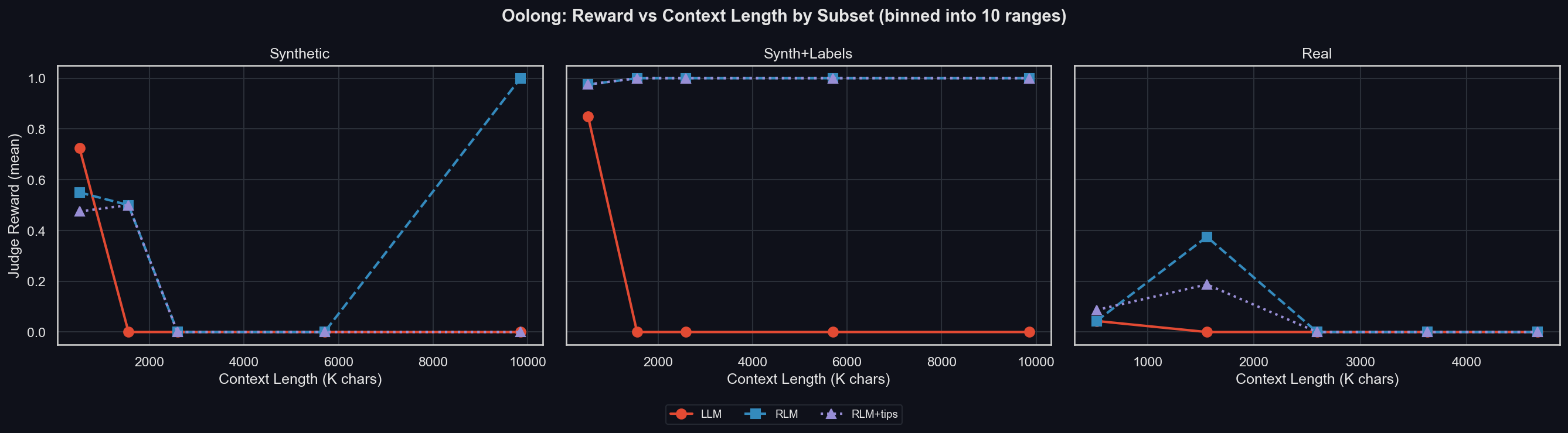 We can see that the dip originates from missing samples from Synth+Labels in those bins, and a weird performance spike at the longest context lengths for the RLM. For the most important, real data, the RLM is significantly better than the LLM at a context length of around 1.5M characters (~300-400k tokens). Beyond that, no model can succeed.
