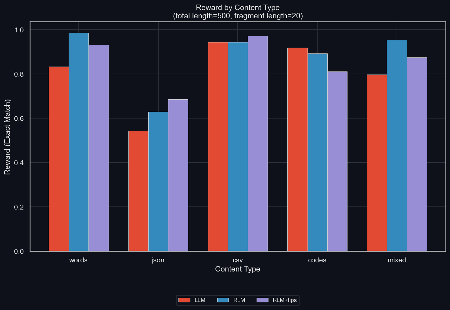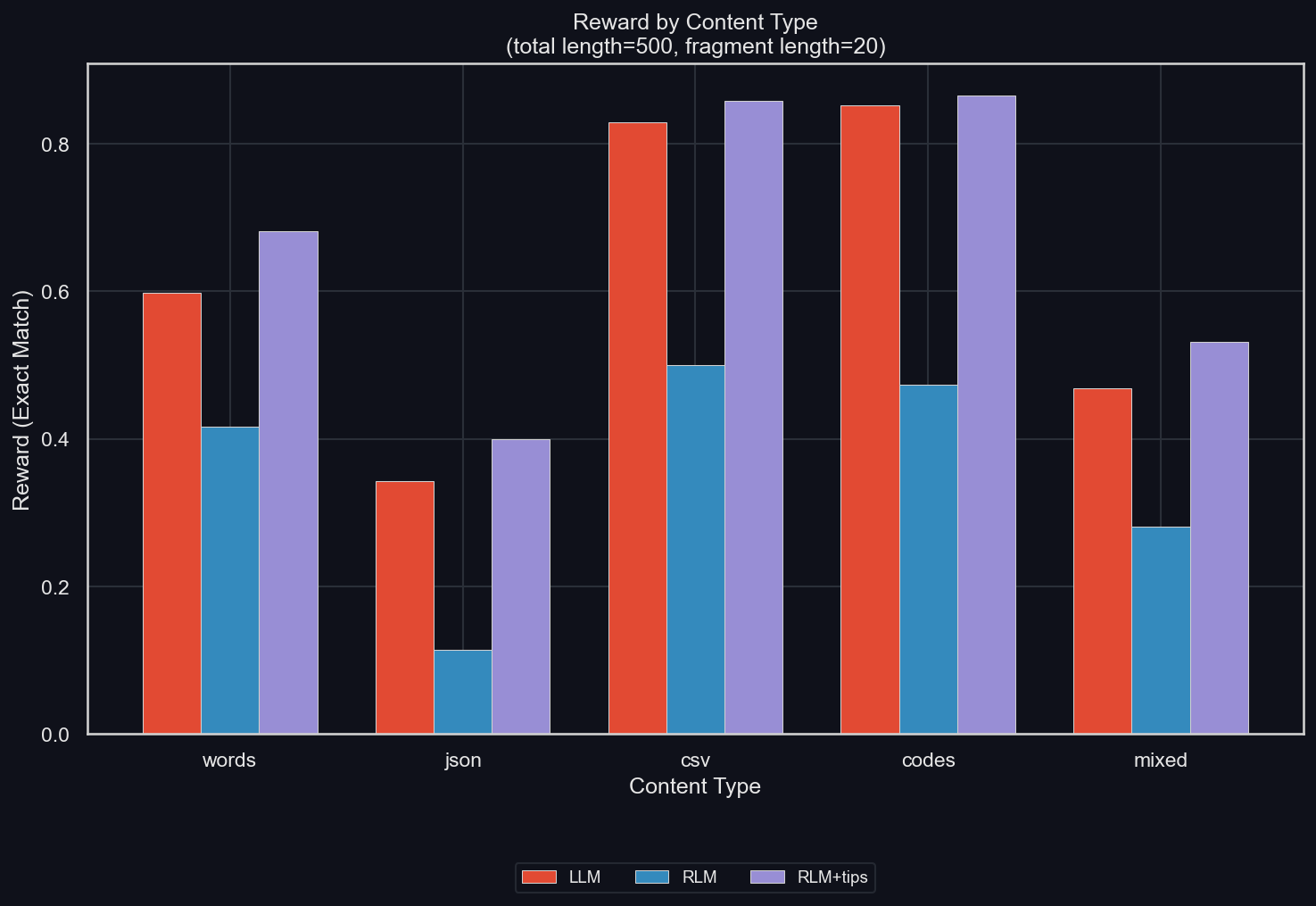 The JSON data is clearly the most difficult, and most helped by the RLM. This goes against the argument brought up before: that the RLM's problem is with escape characters in tool-calls. That's because those must be used the most with JSON data.