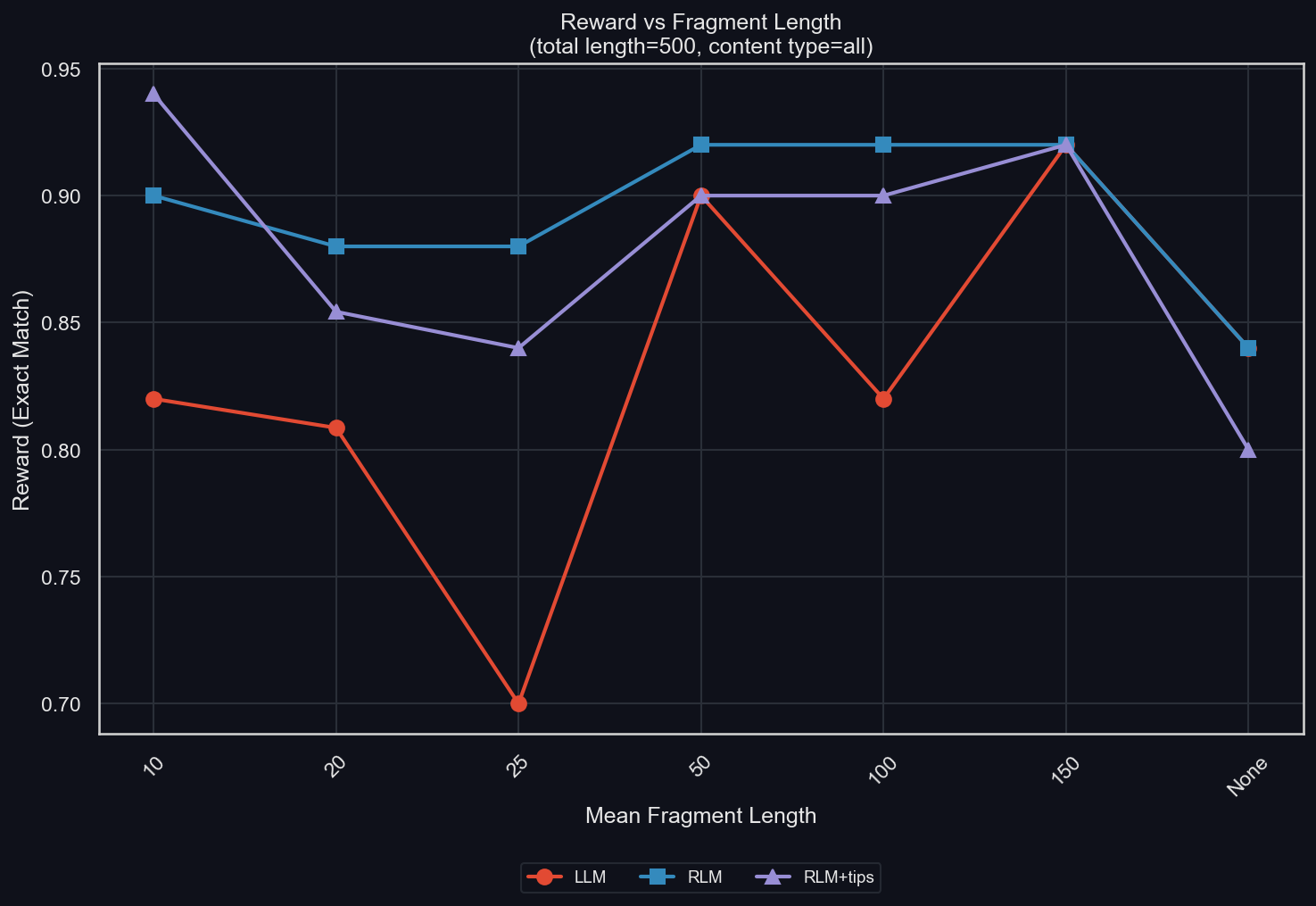 What this plot shows is that there is no clear relationship between fragment length and reward; this modification seems to not make a big difference; at least not for the RLM! For the standard LLM, finer fragmentation tends to lead to worse results, increasing the performance difference between it and the RLM.