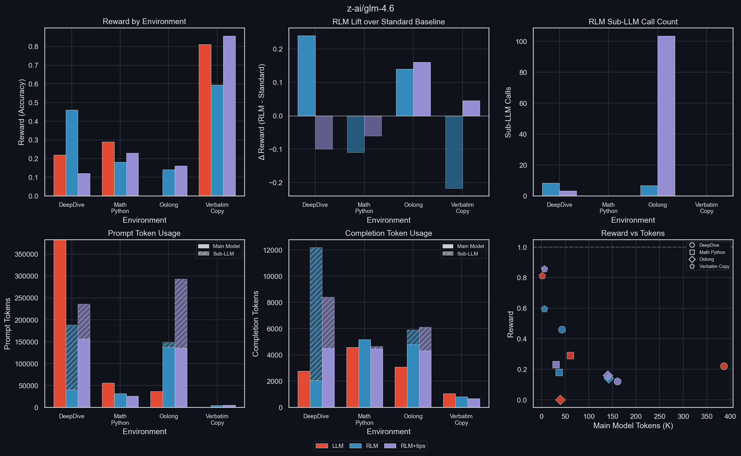 For math-python, we can see that like with GPT-5-mini, the performance is reduced by the use of the RLM. However, as opposed to GPT-5-mini, GLM 4.6 doesn't achieve this by thinking for longer but dumber; instead, it simply thinks less, as seen in the Reward vs Tokens plot.
