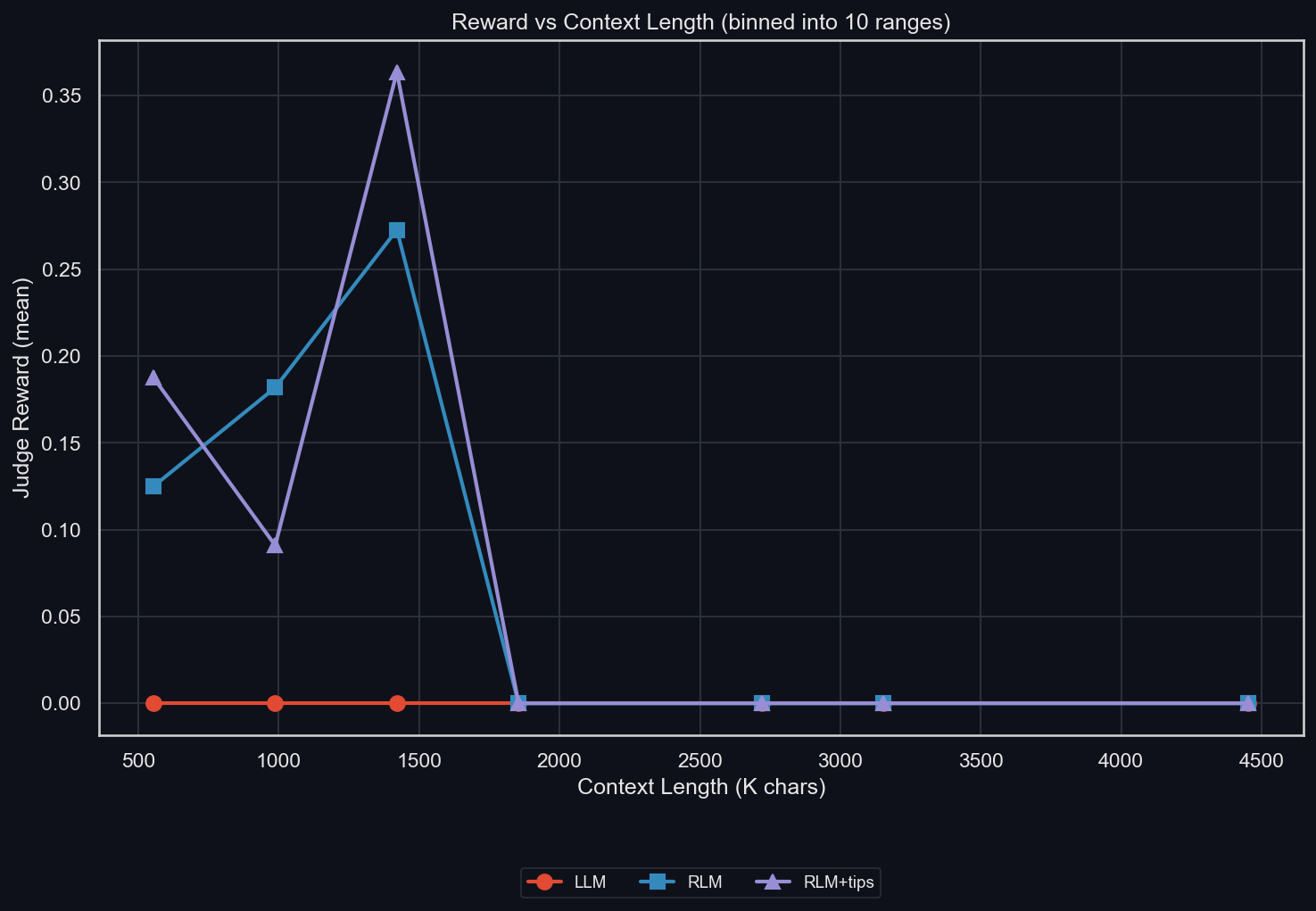 The RLM gets decent rewards up to fairly long contexts of up to ~1.75M characters, but 0 beyond that. The LLM always gets zero reward. Note: this is on "real" data.