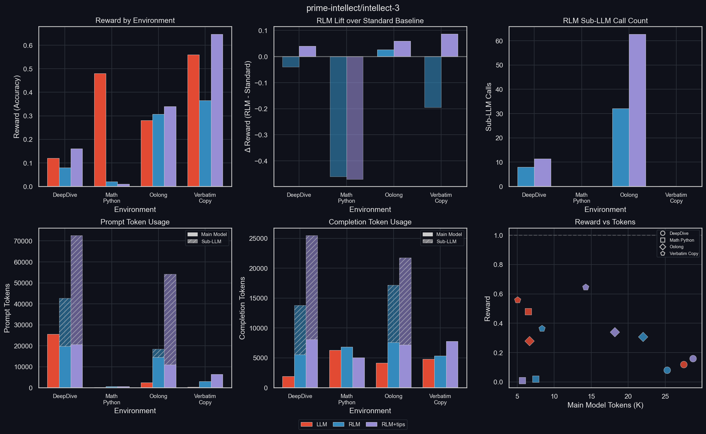 Our own INTELLECT-3 follows the same trends as the other models. It seems to benefit greatly from environment tips, and uses a large number of tokens (a similar number as GPT-5-mini, though for less average reward). For some reason, it is almost completely incapable of using the RLM in math-python, though it does so just fine in other environments.
